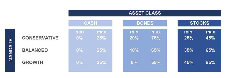 The Table below illustrates our three primary balanced portfolio mandates: Conservative, Balanced and Growth.